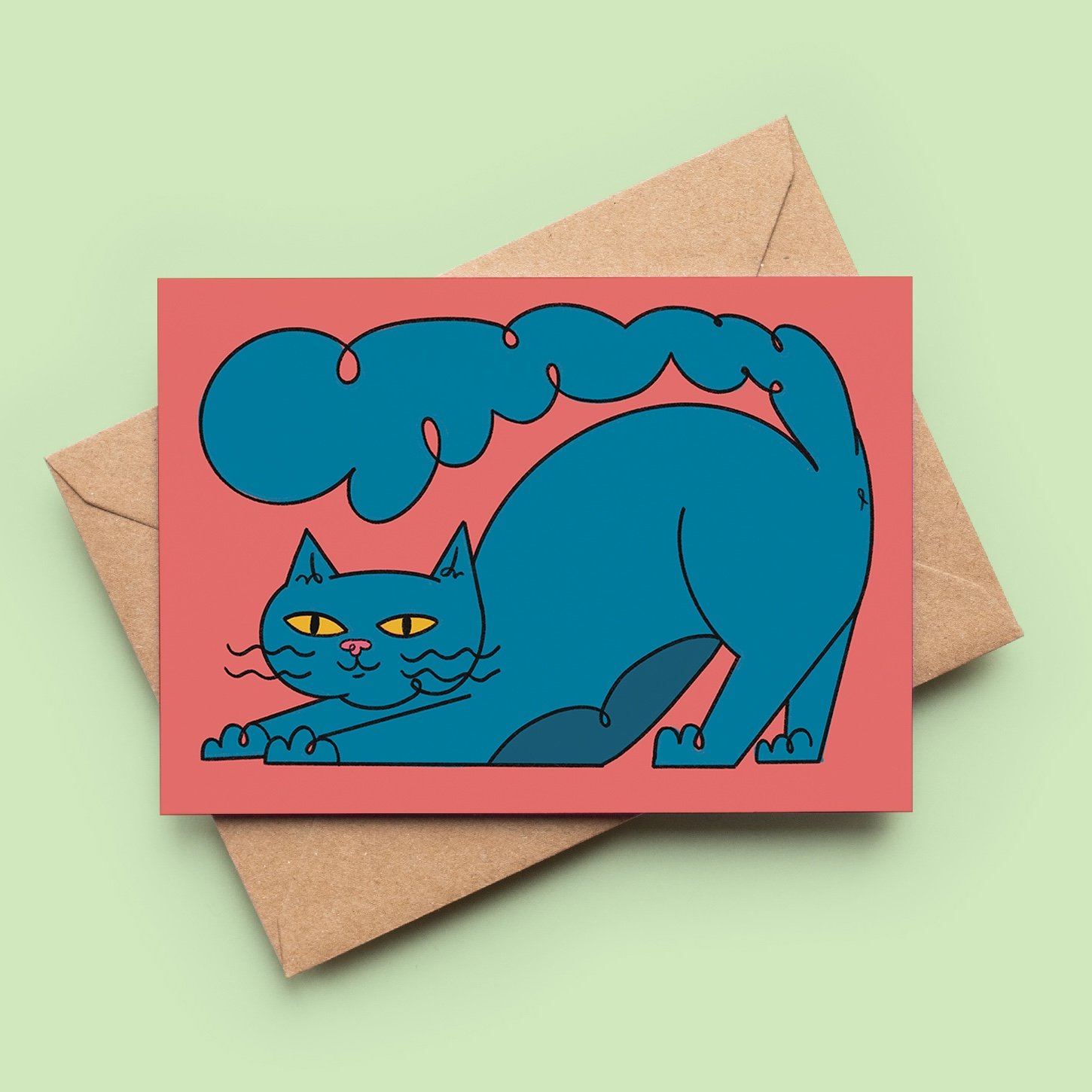 Perfect card for all occasions for cat fans. Lovely blue cat on coral background having a stretch. Card is blank on the inside for your own message. Ideal for any occasion and cat lovers as a tiny print!
