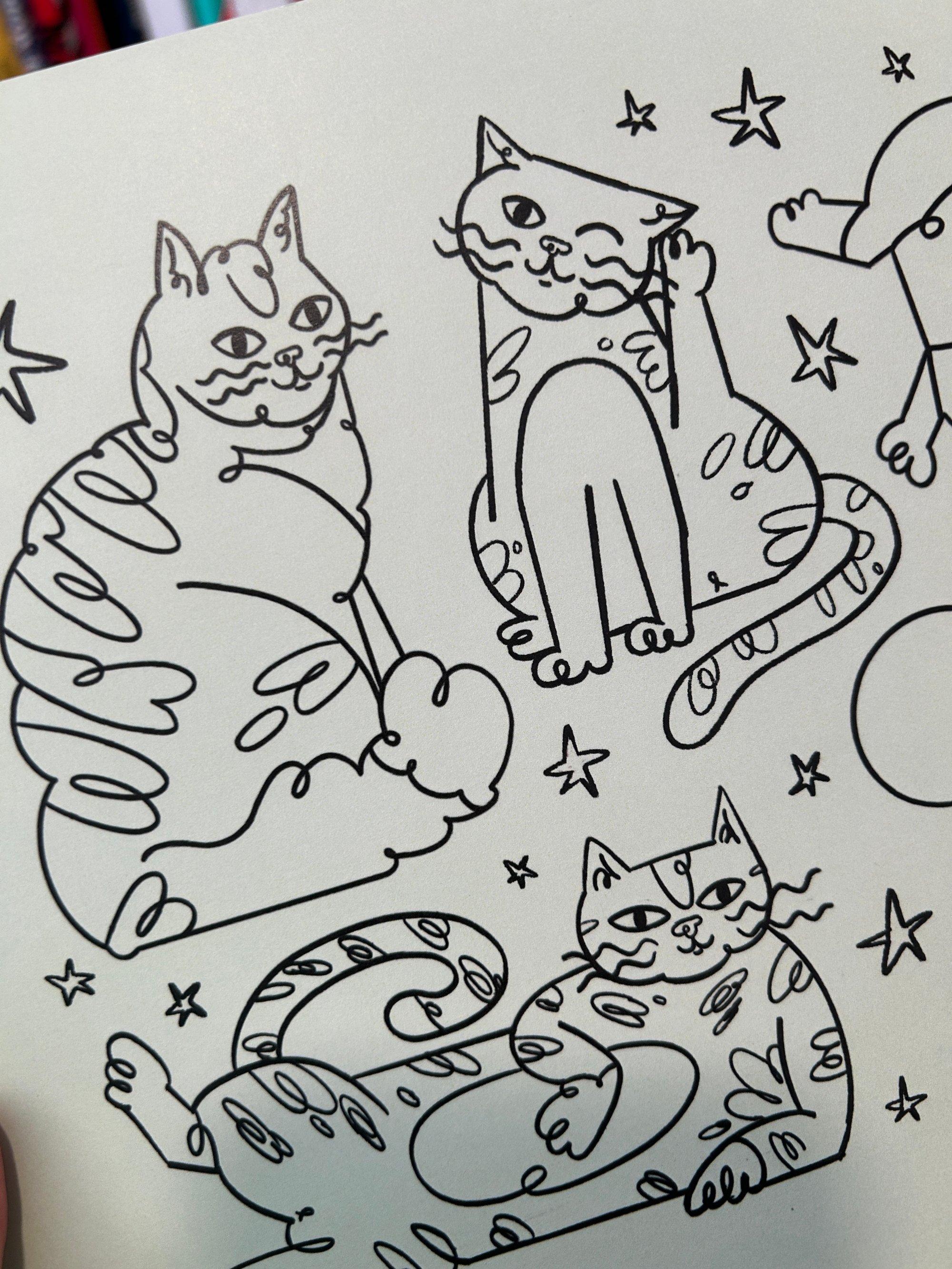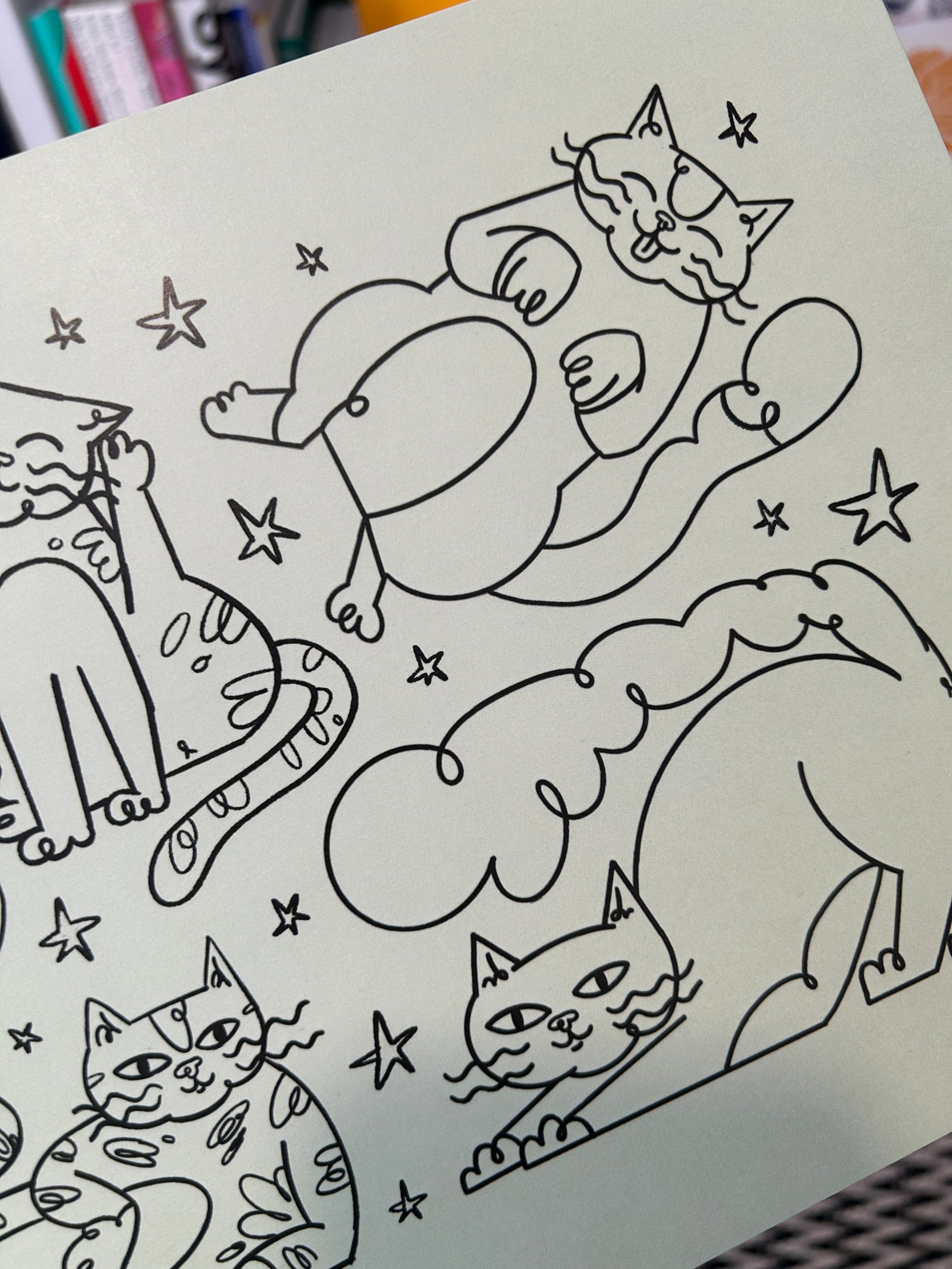 Calling all cat fans! 5 individual cats as line art surrounded by stars on a sage green background. Printed on heavyweight recycled card stock.