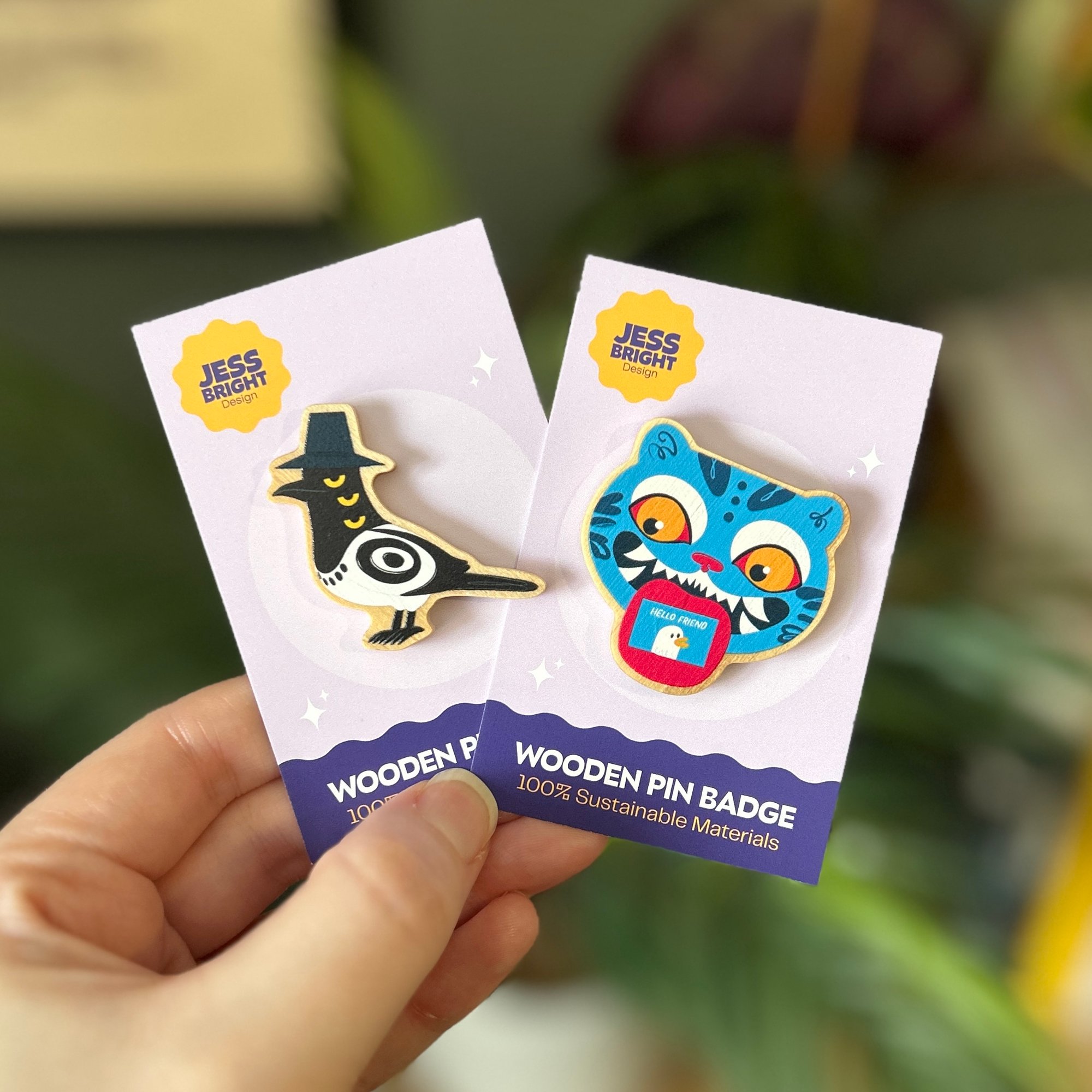 40mm Pin Badge. 4mm thick Maple veneered MDF made with responsibly sourced and fast-growing woods. By sourcing fast-growing woods from ethical suppliers, I can use environmentally friendly materials, whilst actively funding responsible woodland management schemes.