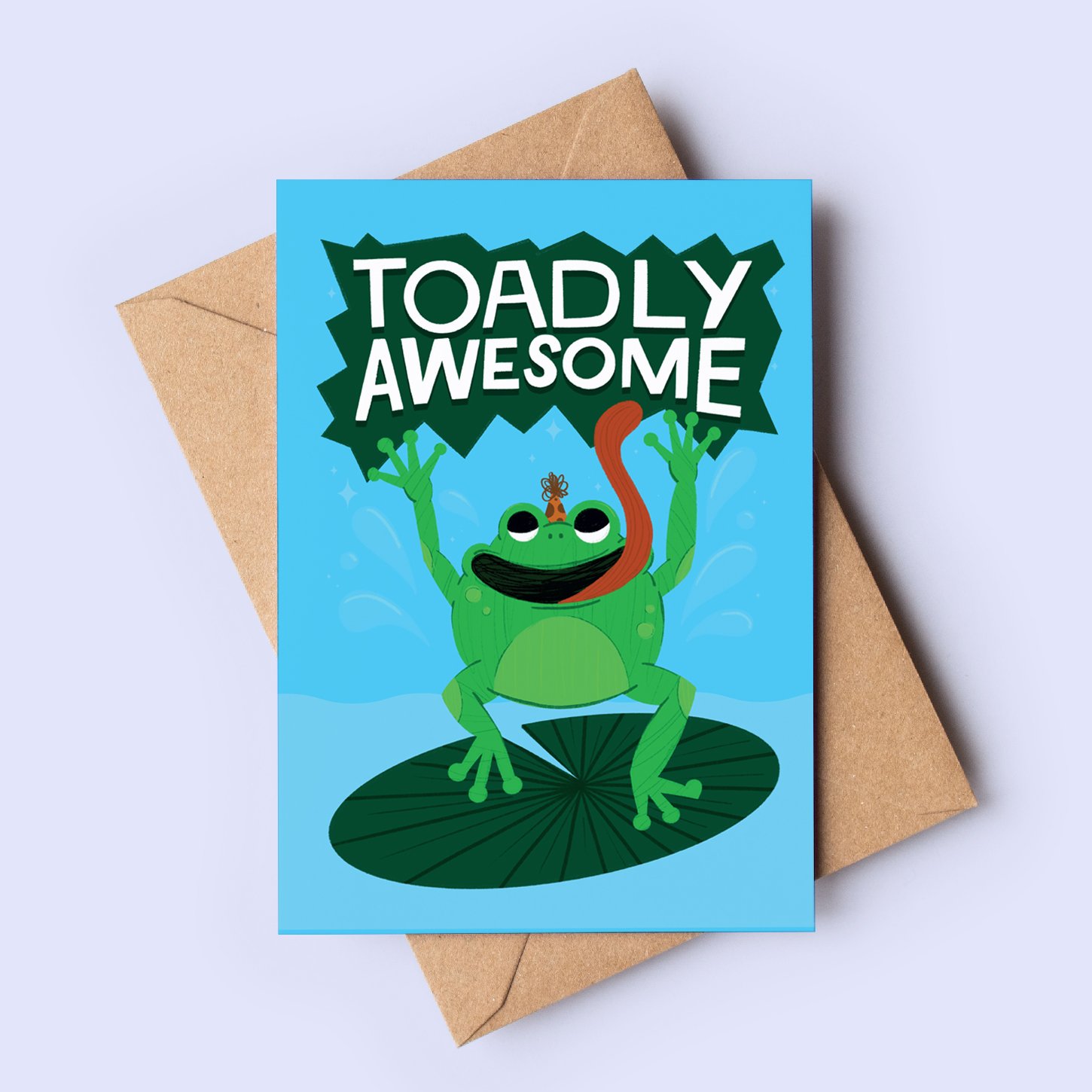 Perfect card for any occasion! Cute and cheery toad surrounded by hand lettered text. Card is blank on the inside for your own message. Ideal for any occasion and as a tiny print!